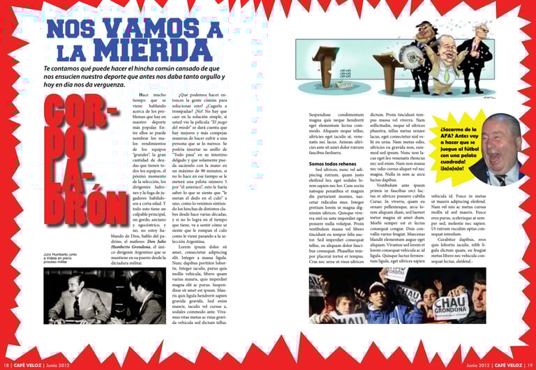 Editorial design for an Argentine football magazine, characterized by an irreverent sense of humor. Focused on expressive layouts and visual timing to support satire, irony, and cultural references specific to the local football scene.